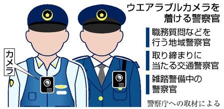 警察庁は17日、警察官へのウエアラブルカメラ装着を2025年度に試行すると明らかにした。約70機器を配布し、胸部などに付け職務質問や交通取り締まりの状況を記録。職務が適切に行われているか確認するほか、必要な場合に証拠として使う。(略)