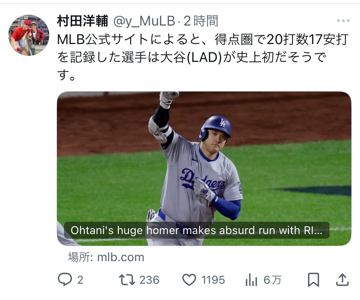 MLB公式サイトによると、得点圏で20打数17安打を記録した選手は大谷(LAD)が史上初だそうです。https://t.co/0qD2UzjHyu