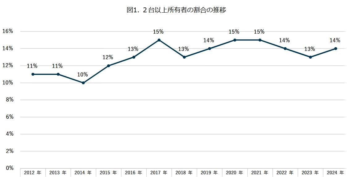 モバイル社会研究所の調査(2024年1月)は、全国の15~59歳男女6440人が対象だ。【図表1】が、2012年以降の携帯電話(スマホ)の2台以上所有者の割合の推移だ。ここ12年は10数%前後で大きな変化がない。2024年は前年より微増の14%だった。