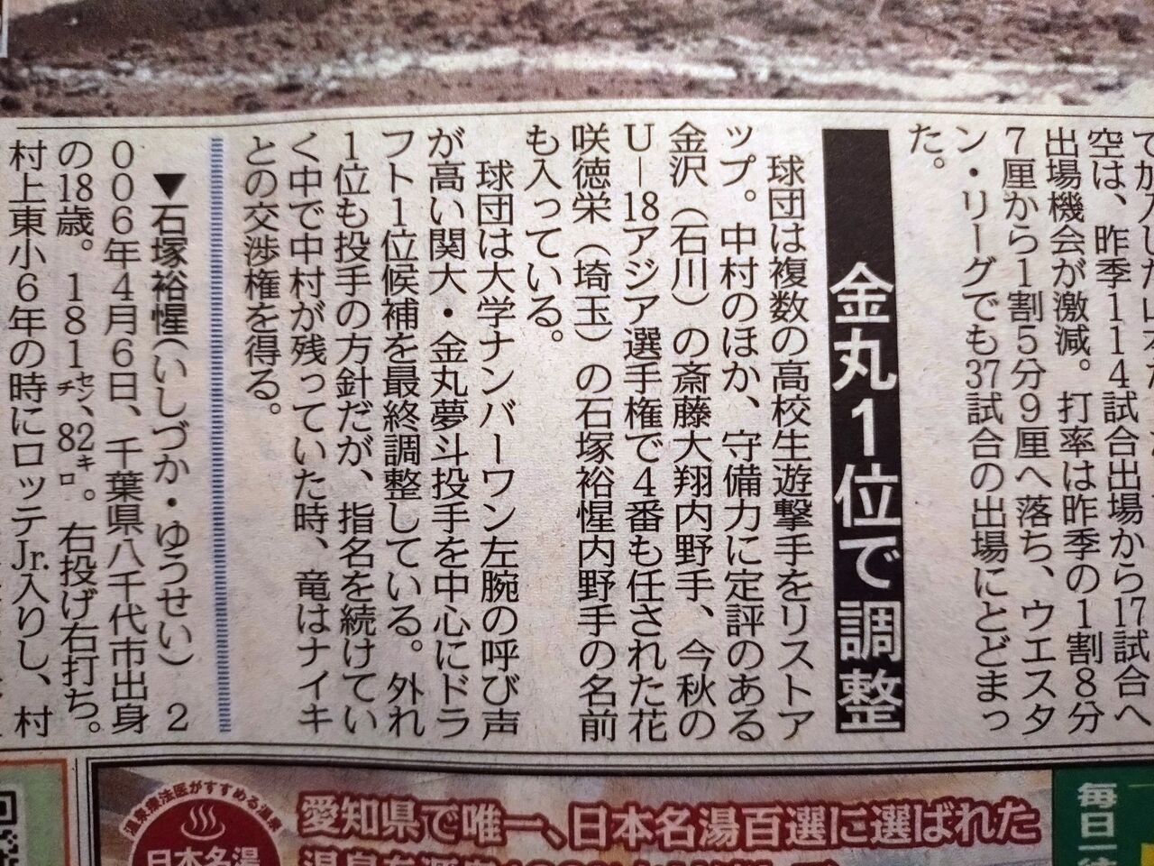 外れ1位は高校生遊撃手が有力で中村ナイキ(宮崎商業)が特に有力とのこと