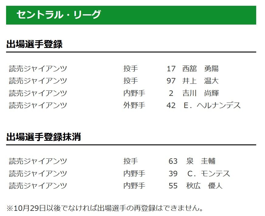 【10/19公示】巨人、吉川尚輝、ヘルナンデス、西舘勇陽らが一軍登録 モンテスらが登録抹消