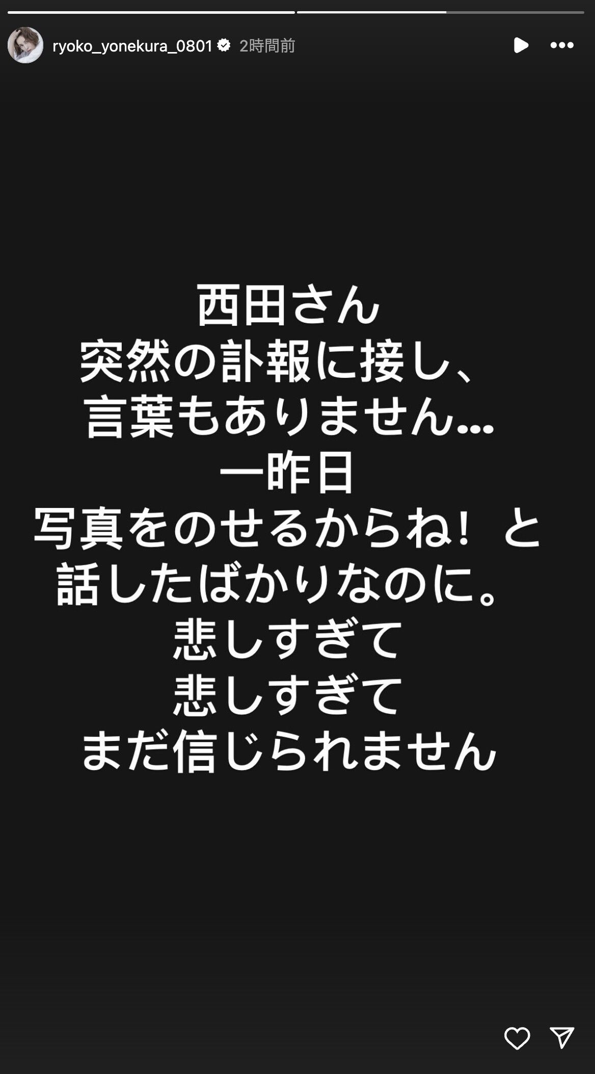 米倉はストーリーズで「西田さん 突然の訃報に接し、言葉もありません…」と追悼。「一昨日写真をのせるからね!と話したばかりなのに」と直前まで会話していたことを告白。訃報の約1時間前には西田さんとの食事中の2ショットをストーリーズに投稿していたばかりだった。