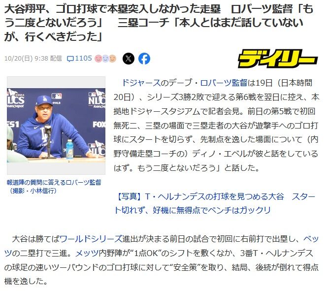 大谷翔平、ゴロ打球で本塁突入しなかった走塁 ロバーツ監督「もう二度とないだろう」 三塁コーチ「本人とはまだ話していないが、行くべきだった」