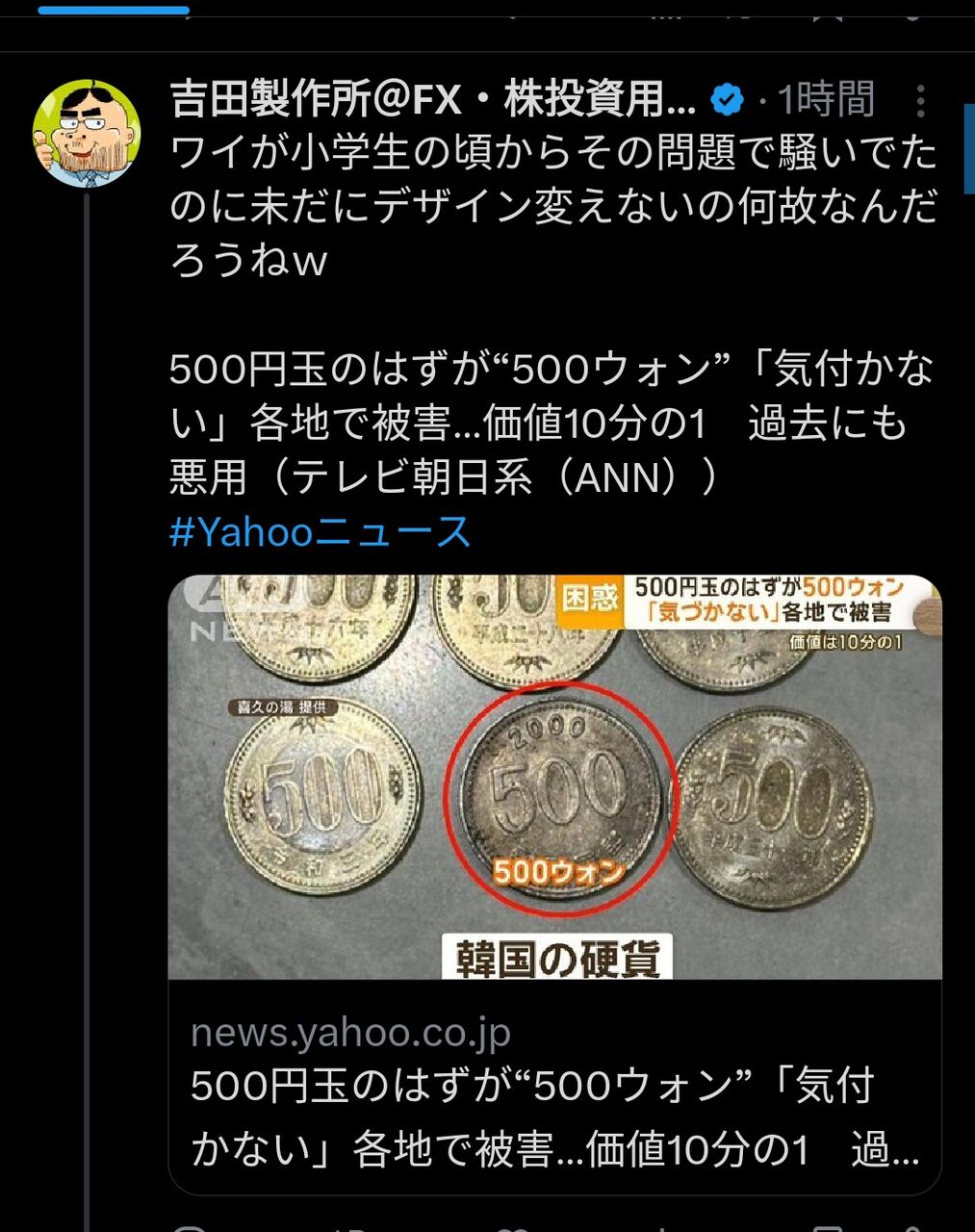 お店「500円と500ウォンが似すぎててわからないの😭」