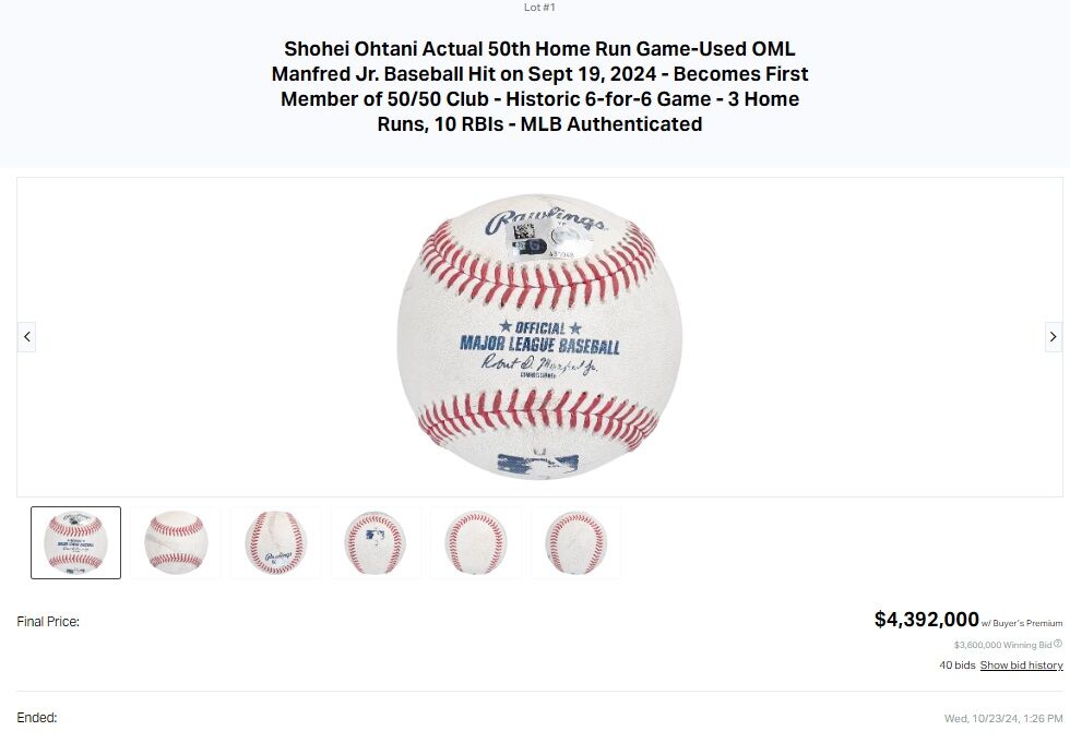 大谷の50号ホームランボールは22日(同23日)に競売が終了し、あらゆるボールの中で最高額となる439万2,000ドル(6億3700万円)で落札された。