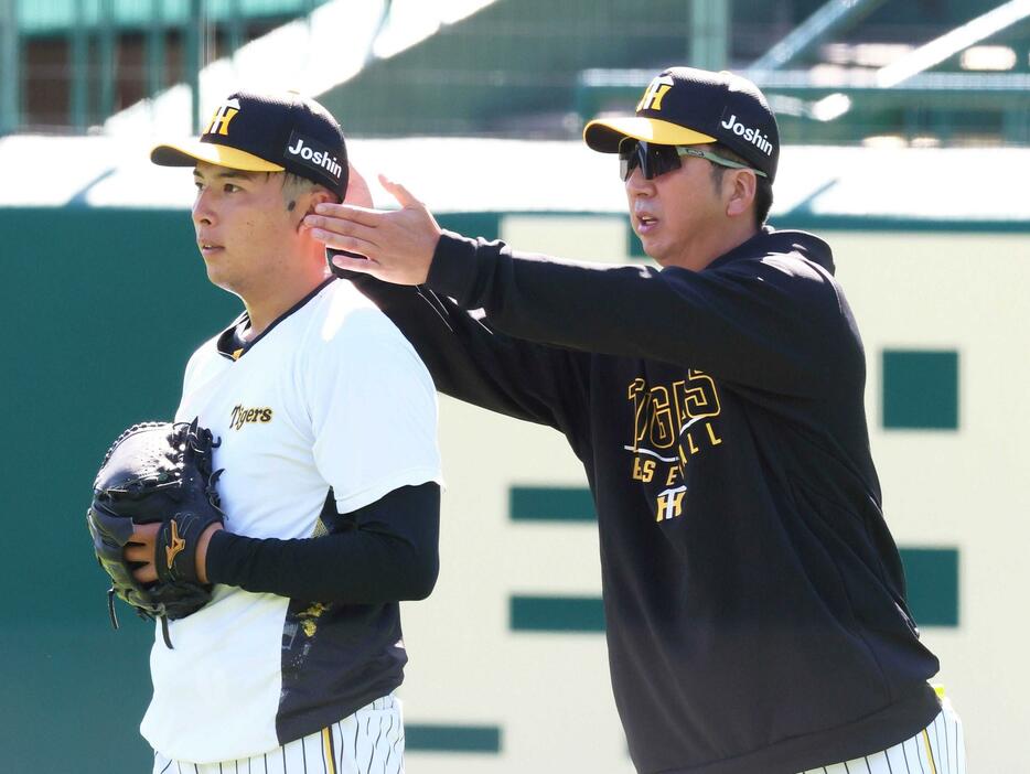 秋晴れのグラウンドでキャッチボールを行う右腕に歩み寄った藤川監督。フェニックス・リーグを視察した際、「改善ができる」と、名前を挙げていた右腕のマンツーマンレッスンが始まった。腕の振りや体の使い方などを指導。指揮官の提案で、軸足で1度ステップを踏んでからの投球を繰り返すなど、課題改善に励んだ。