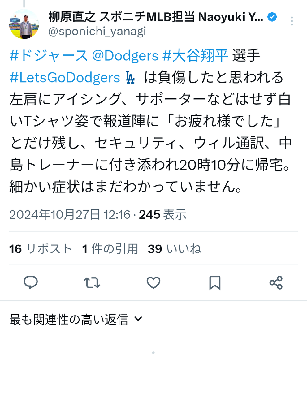 左肩負傷の大谷翔平「お疲れ様でした」と試合終了2分後に球場引き上げ 患部にアイシングや固定はなし