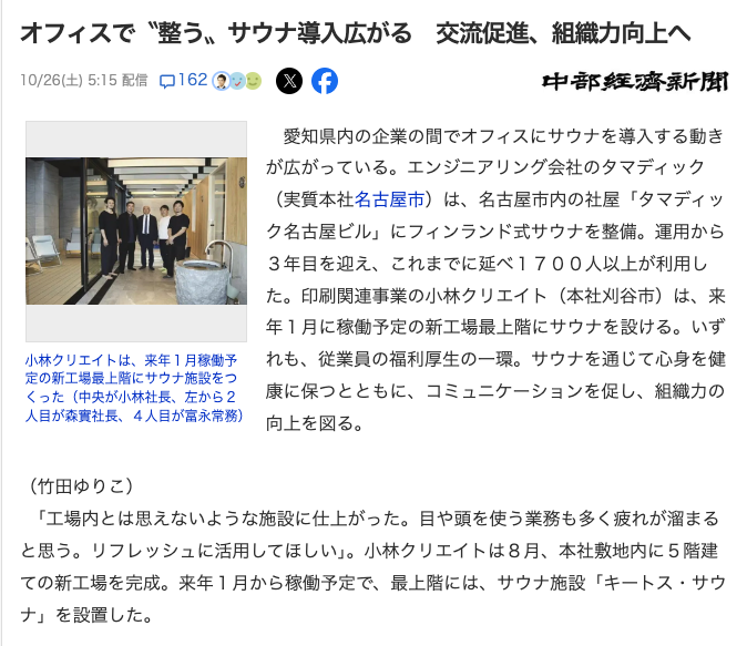 愛知県内の企業の間でオフィスにサウナを導入する動きが広がっている。エンジニアリング会社のタマディック(実質本社名古屋市)は、名古屋市内の社屋「タマディック名古屋ビル」にフィンランド式サウナを整備。運用から3年目を迎え、これまでに延べ1700人以上が利用した。印刷関連事業の小林クリエイト(本社刈谷市)は、来年1月に稼働予定の新工場最上階にサウナを設ける。いずれも、従業員の福利厚生の一環。サウナを通じて心身を健康に保つとともに、コミュニケーションを促し、組織力の向上を図る。