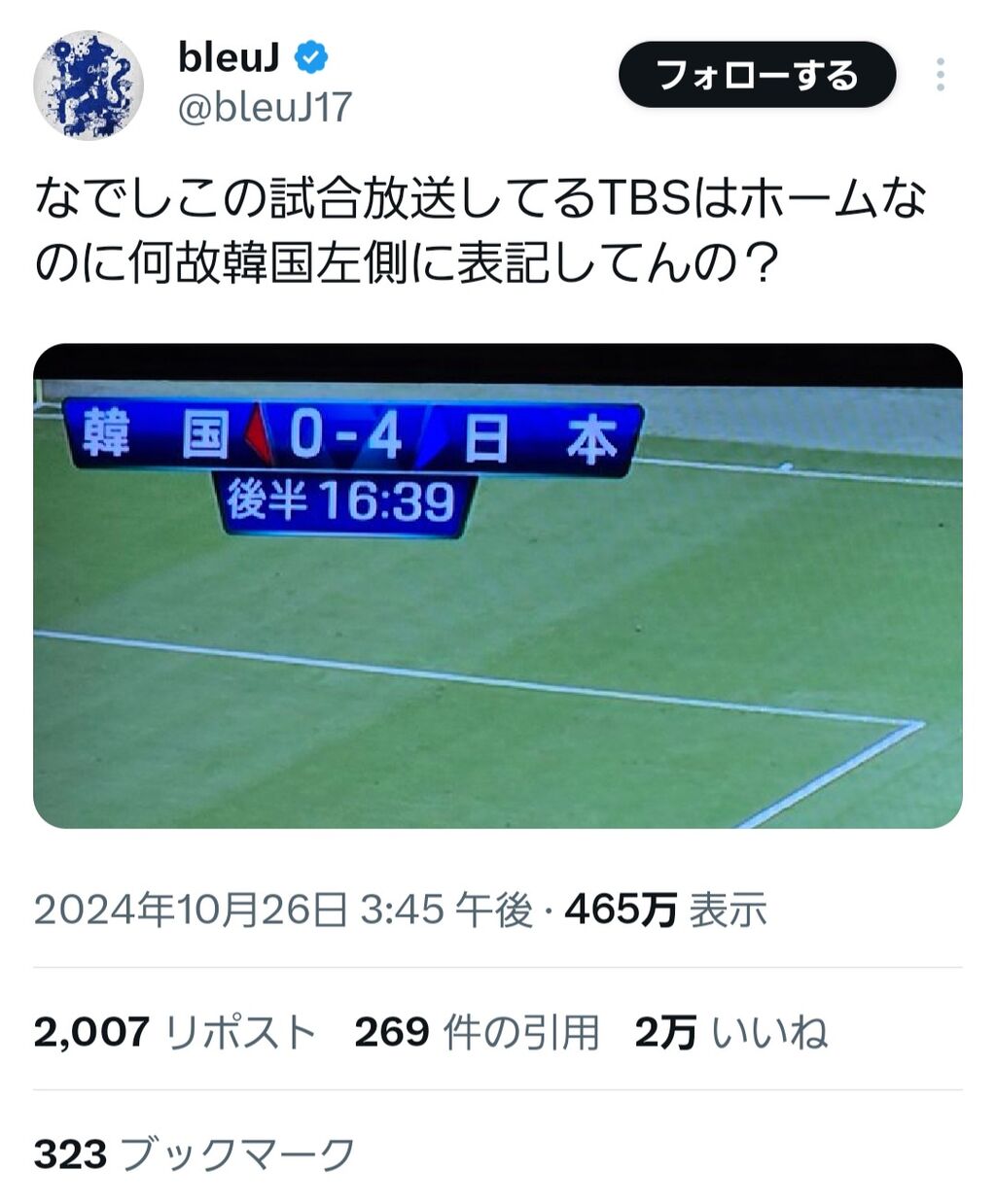 【悲報】サカ豚さん、勘違いでTBS&韓国叩き→ネトウヨ認定されて逆ギレ「日本はサッカー後進国」