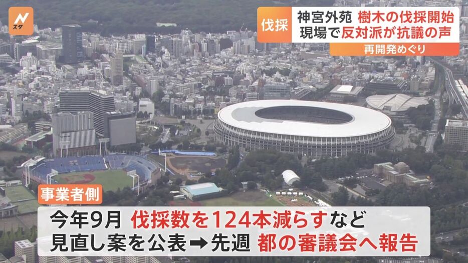 事業者側は今年9月、伐採する樹木を124本減らすなどとする見直し案を公表。先週、東京都の審議会へ報告し、当初の予定よりも1年遅れての着工となりました。