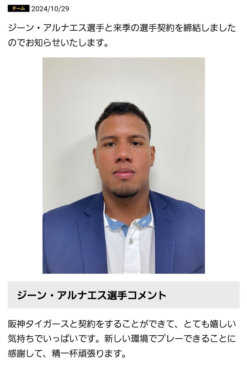 阪神が新外国人アルナエスとの契約を発表「とてもうれしい気持ちでいっぱい」パナマ出身