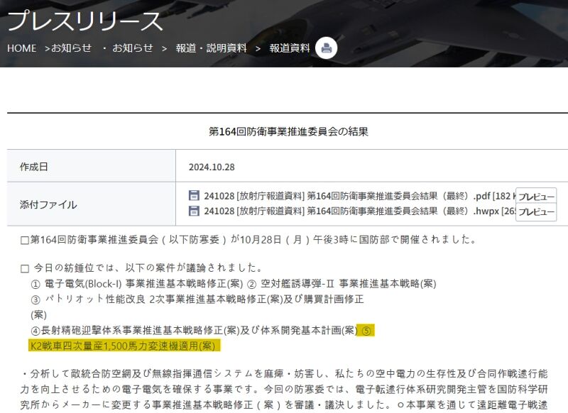 2024年10月28日、韓国の防衛事業が「第164回防衛事業推進委員会」を開催。以下のようなプレスリリースを出しました。