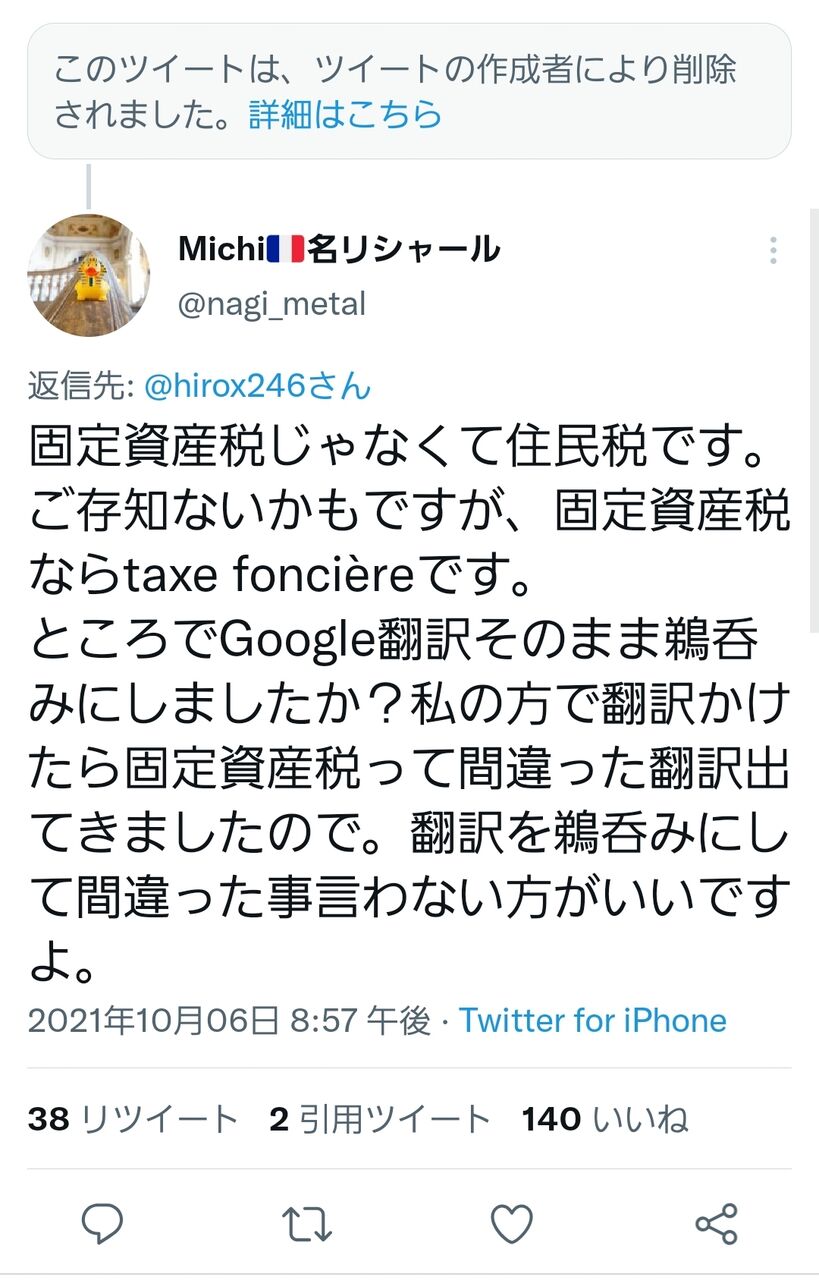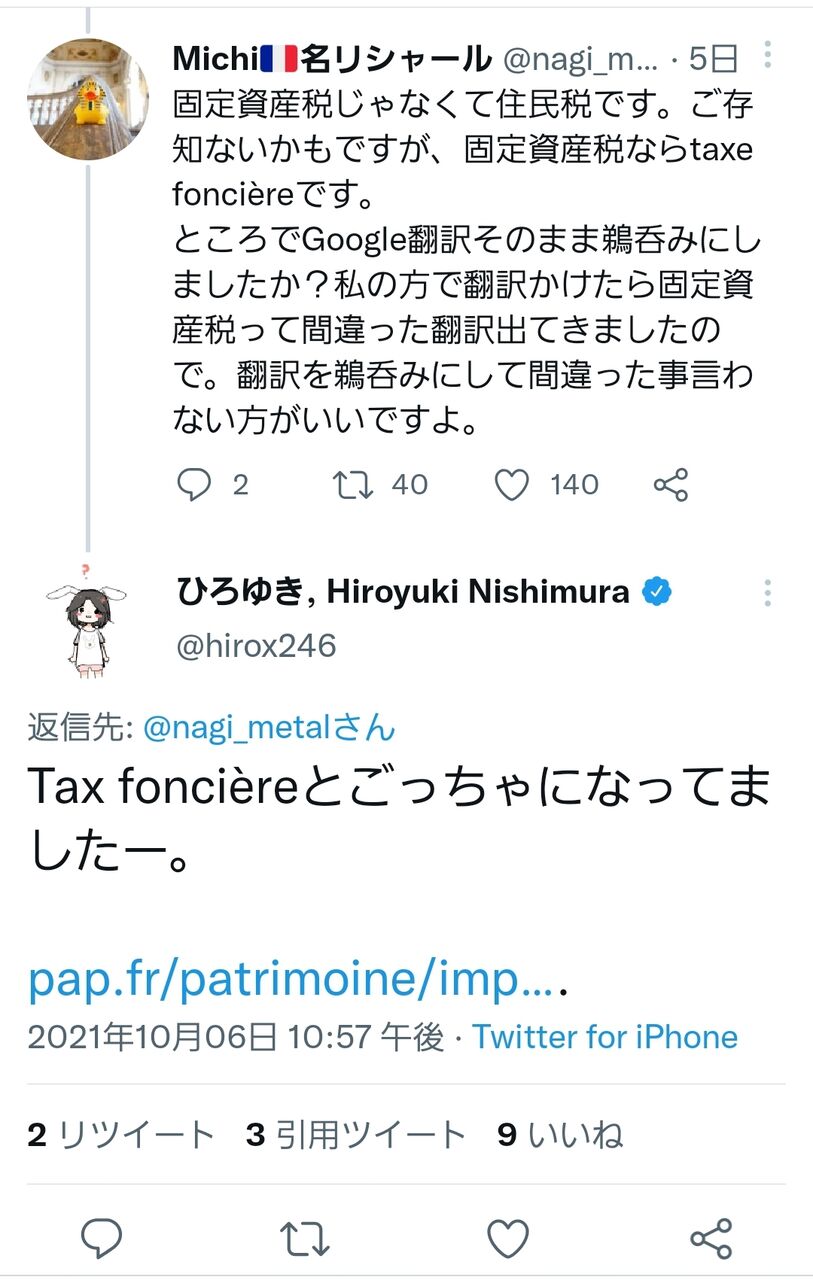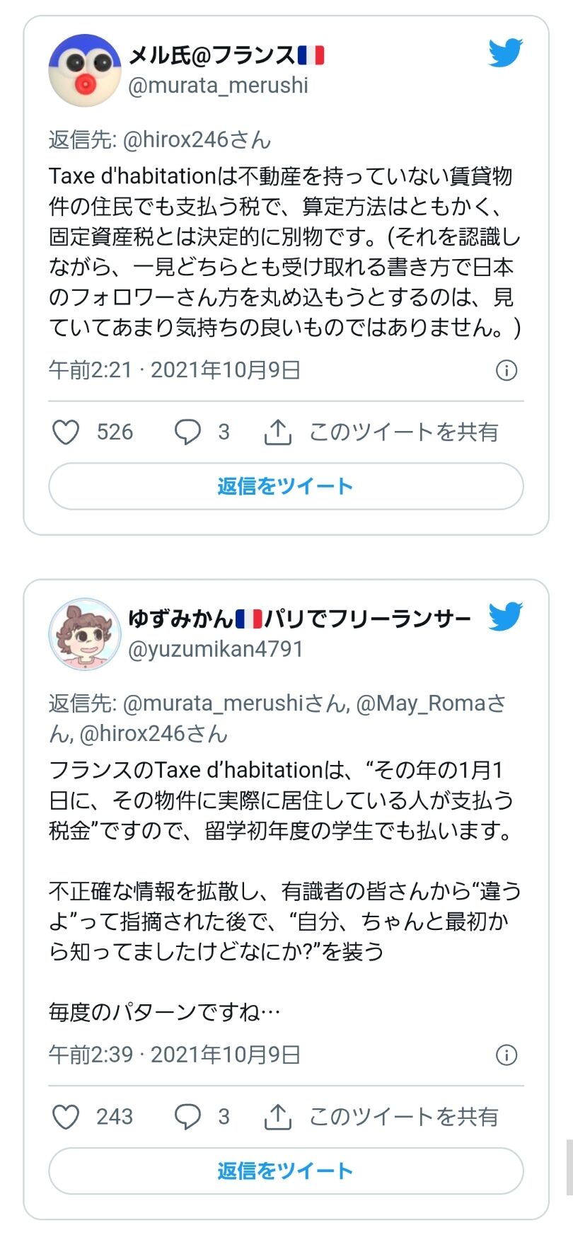 10月8日には再度、”Taxe d’habitation”につき「固定資産税に近い算定」とツイートするも多数のユーザーから「日本で言えば住民税とするのが近い/固定資産税とはまったく別物」と指摘を受けています。