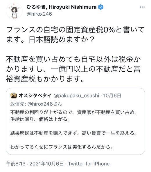ひろゆき氏が「フランスは2023年までに固定資産税を0%に」とツイートしています。