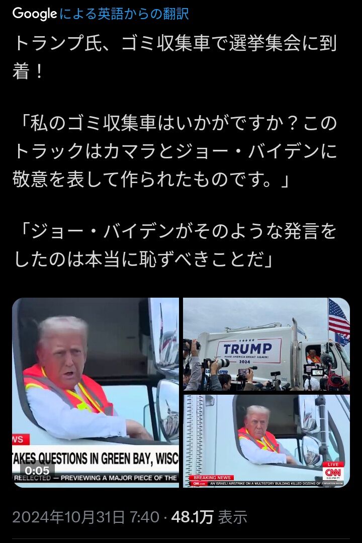 【画像】バイデン「トランプ支持者はゴミ」→ トランプ、ゴミ収集車に乗り選挙集会に到着