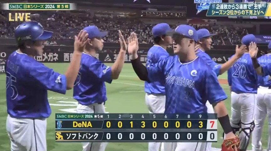 【日本シリーズ第5戦】DeNAが7-0でソフトバンクに3連勝!26年ぶり日本一王手!筒香嘉智V打&牧秀悟3ラン!ソフトバンクは2試合連続完封負け