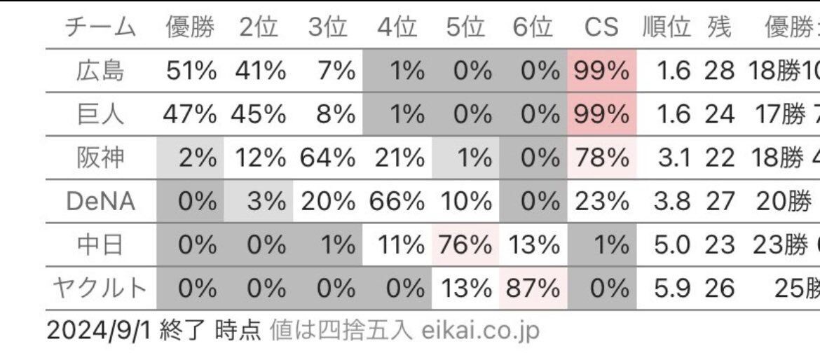カープ、優勝確率51%・CS進出確率99%