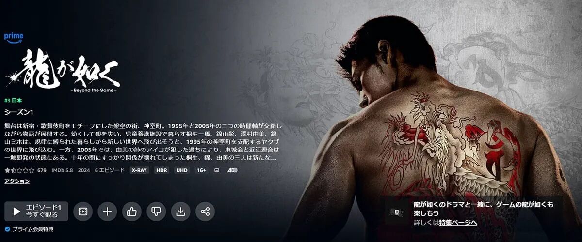 俳優の竹内涼真が主演するドラマ『龍が如く~Beyond the Game~』がPrime Videoで世界独占配信されている。本作は同名の人気ゲームシリーズの実写化作品だ。