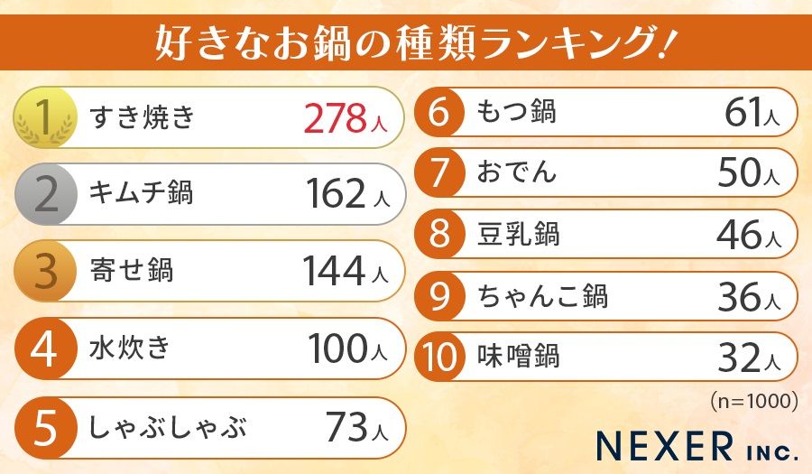 :2024/11/03(日) 20:01:58.45 ID:2Wnczcv59インターネットリサーチ事業を展開するNEXER社はこのほど、業務用総合食材通販の八面六臂社と共同で、全国の男女1000人を対象に「一番好きな鍋」に関するアンケートを実施し、調査結果をランキング形式で公開した。