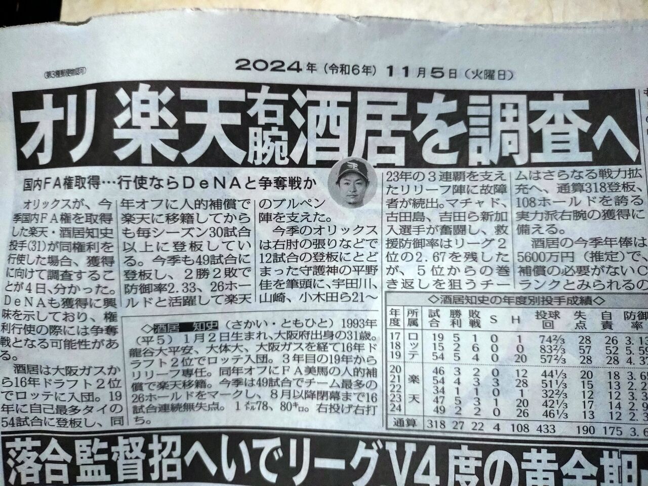 酒居の今季年俸は5600万円(推定)で、補償の必要がないCランクとみられるのも魅力の一つ。きょう5日からFA有資格者の申請期間が始まる中、動向に注目が集まる。