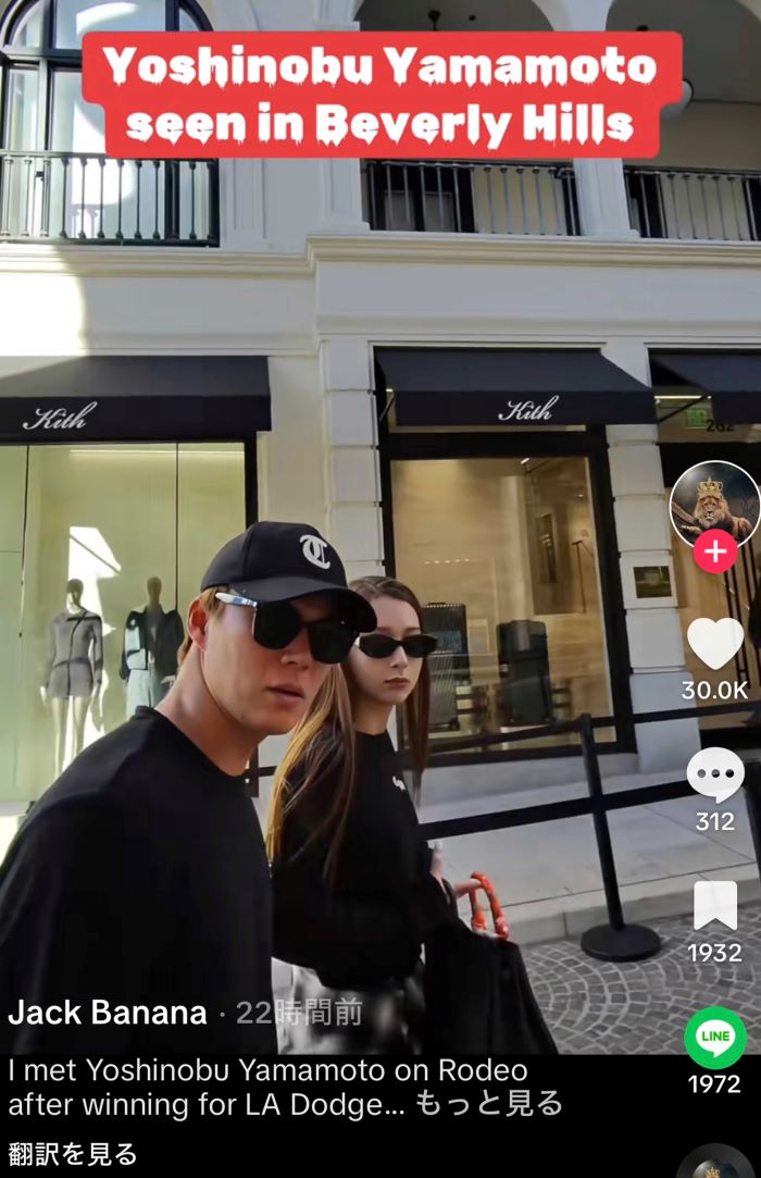 「注目されている動画は、TikTokで配信されているものです。動画の撮影者は、ロサンゼルスのビバリーヒルズで山本選手に話しかけ、“ドジャースの山本か?”といった本人かどうかの確認をしていました。黒いサングラスをかけていても、明らかに山本投手ですね(笑)。