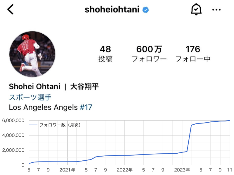 【朗報】大谷翔平のインスタのフォロワーが1年間で260万人も増えていた事が判明