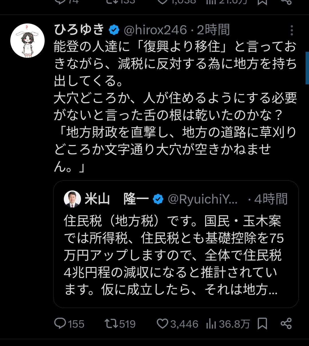 能登の人達に「復興より移住」と言っておきながら、減税に反対する為に地方を持ち出してくる。