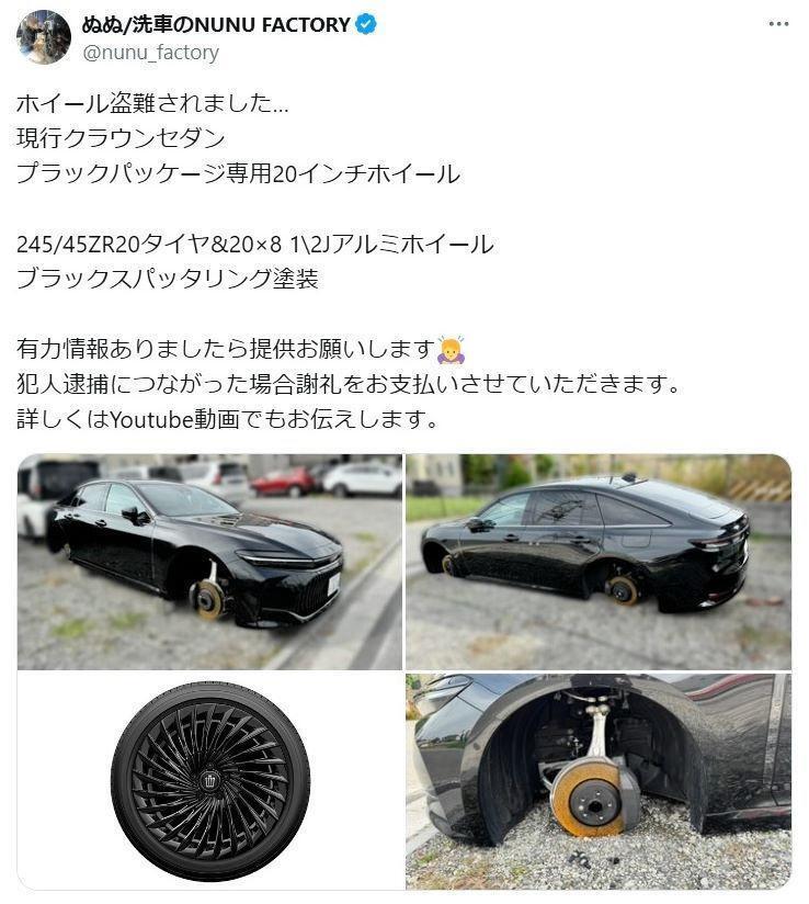 登録者15・9万人という人気女性YouTuberの「ぬぬふぁくとりー」が、駐車場にとめていた愛車、トヨタ・クラウンセダンのホイール4本すべてが盗難にあったことを明かした。