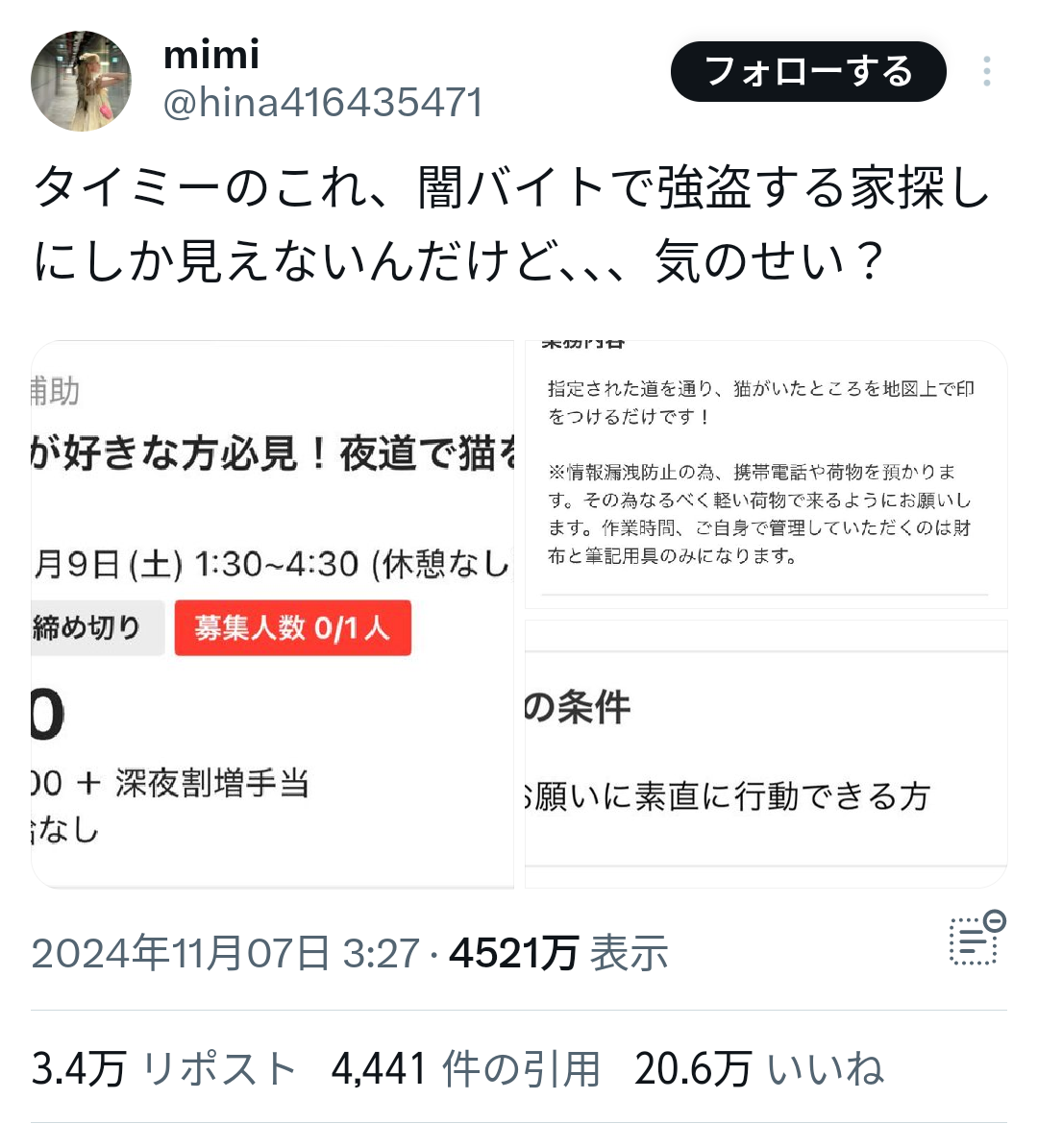 「タイミー」で闇バイト募集疑惑「深夜に猫を探す高収入バイト」…代表取締役が言及 怪しい求人に注意喚起「速やかに検知し差し止め」❓❗