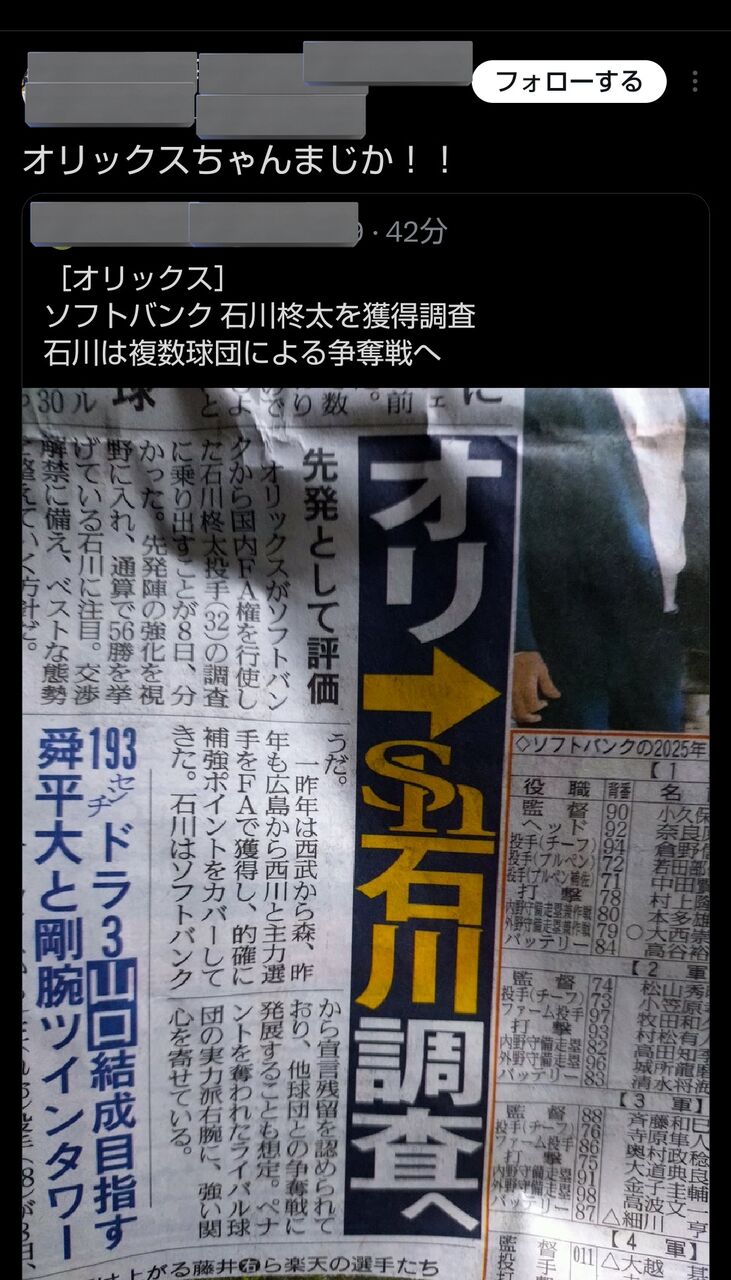 【オリックス】ソフトバンクから国内FA権を行使した石川柊太の調査へ