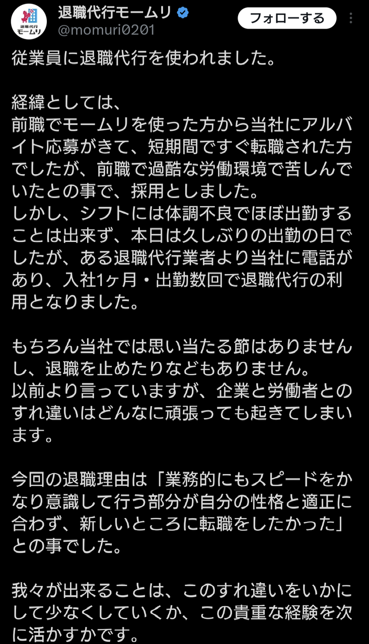 前職でモームリを使った方から当社にアルバイト応募がきて、短期間ですぐ転職された方でしたが、前職で過酷な労働環境で苦しんでいたとの事で、採用としました。…— 退職代行モームリ (@momuri0201) November 11, 2024