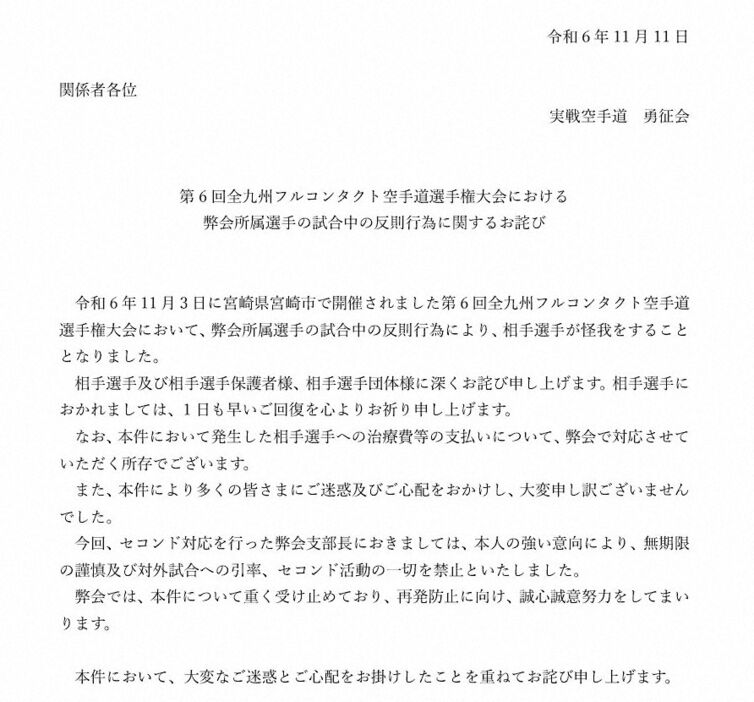 空手指導を行う勇征会は11日、公式サイトを更新。「第6回全九州フルコンタクト空手道選手権大会における弊会所属選手の試合中の反則行為に関するお詫び」を発表した。