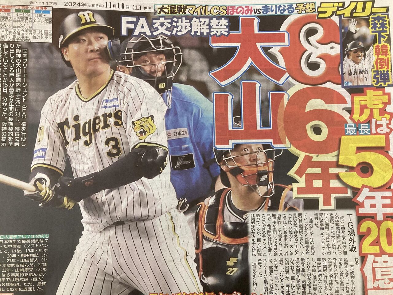巨人FA大山に6年長期契約提示へ 事実上の終身契約 阪神は5年で総額20億円規模 熾烈TG争奪戦 デイリースポーツ