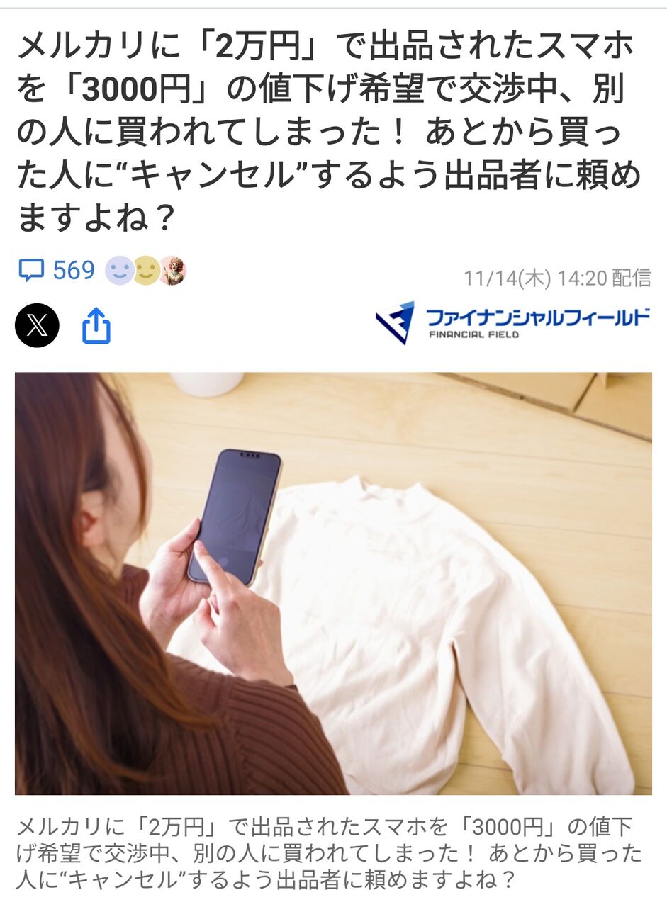メルカリ民「値段交渉中に別の人に落札された!キャンセルさせたい!😭」