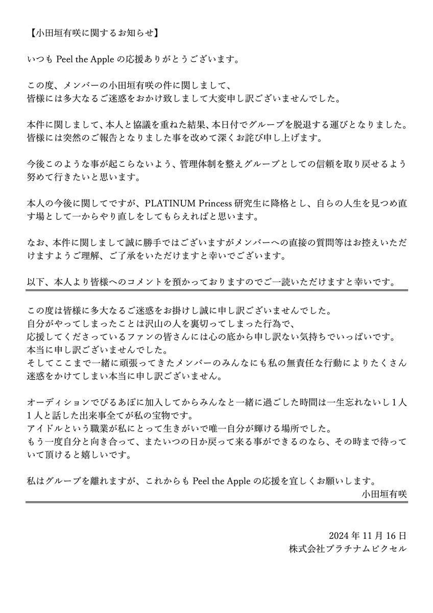公式アカウントは「重要なお知らせ」と題して、文書を4枚公開。「現在取り沙汰されている問題につきまして、ここまで各所と必要な精査・協議を行っておりました」とし、一宮彩夏、神楽胡音、大場結女の3人が「本日付けでグループを脱退することをご報告させていただきます」と発表した。