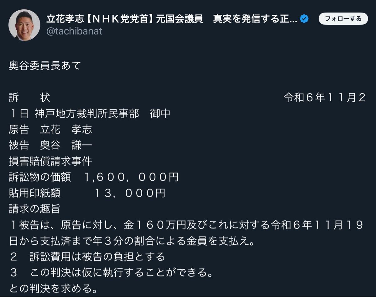 請求の趣旨…— 立花孝志【NHK党党首】 元国会議員 真実を発信する正義の人 (@tachibanat) November 20, 2024