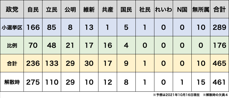 上記の表をもとにすると、自民党が単独で過半数(233議席)を超える可能性があり、