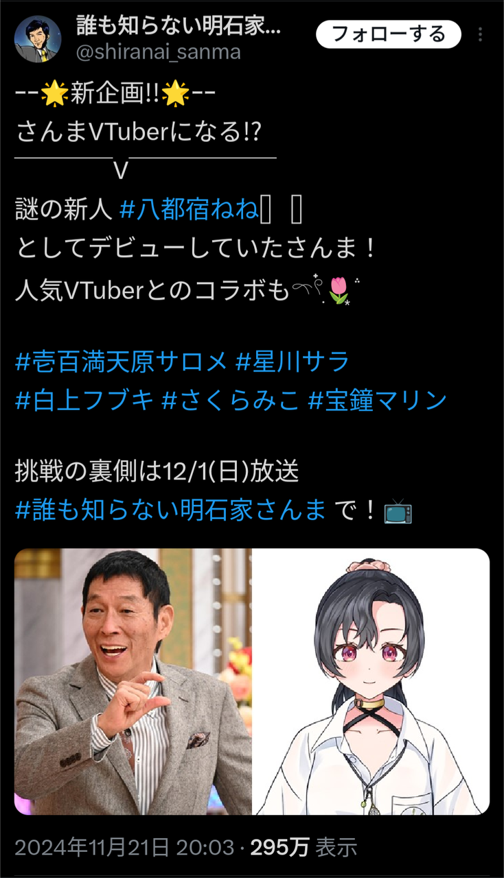 — 誰も知らない明石家さんま12月1日(日)放送【公式】 (@shiranai_sanma) November 21, 2024