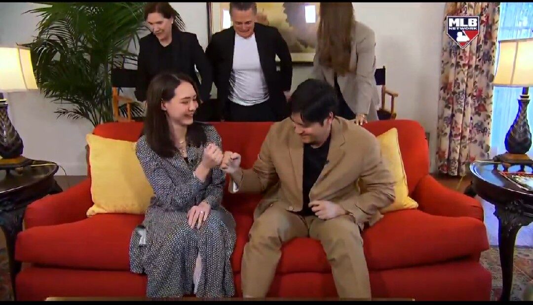 ド軍チームメートのC・カーショー投手が受賞をアナウンスした瞬間、ソファに並んで座った大谷夫妻は笑顔に。関係者らにハグで祝福された後、大谷は真美子夫人とグータッチで祝った。