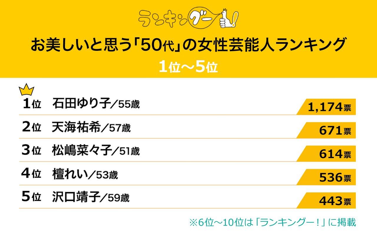 年齢に関係なく、美しい人はいますよね。株式会社CMサイトが企画編集する、「ちょっと気になる」を調べたランキングサイト『ランキングー!』はこのほど、全年代の男女(性別回答しないを含む)1万253人を対象に行った『お美しいと思う「50代」の女性芸能人ランキング』の結果を公開した。