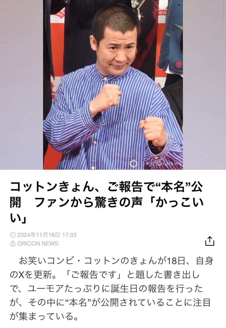 コットンきょん、ご報告で“本名”公開し驚きの声「かっけぇ」 別人級のイケメンだった過去も お笑いコンビ・コットンのきょんが18日、エックスを更新。誕生日の報告をつづり、その中に“本名”が公開されていることに注目が集まっている。 きょんは「私事で恐縮… (出典:) |