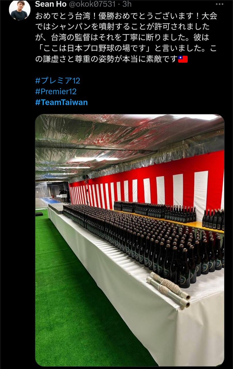 おめでとう台湾!優勝おめでとうございます!大会ではシャンパンを噴射することが許可されましたが、台湾の監督はそれを丁寧に断りました。彼は「ここは日本プロ野球の場です」と言いました。この謙虚さと尊重の姿勢が本当に素敵です🇹🇼#プレミア12#Premier12 #TeamTaiwan pic.twitter.com/Y4CFEUyivv