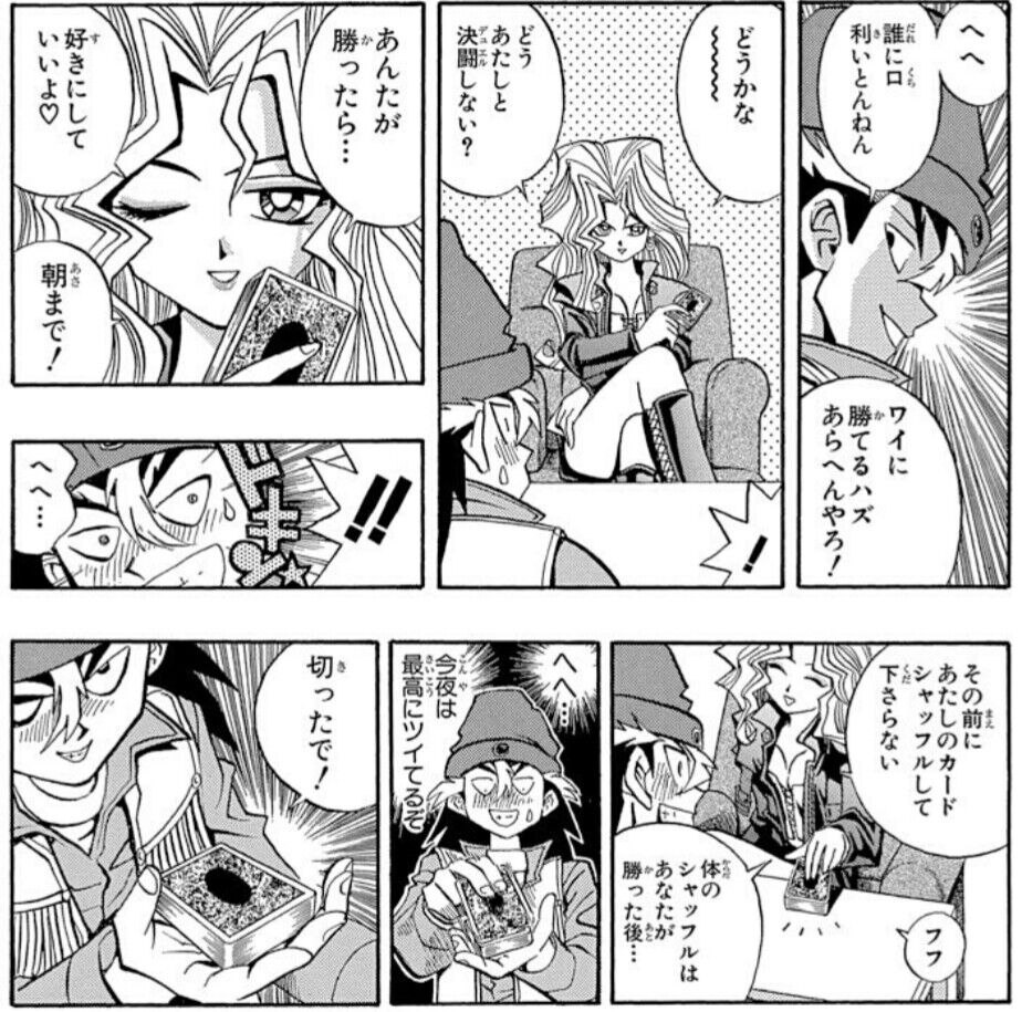 孔雀舞(24)「体のシャッフルはあなたが勝った後…」 城之内(14)「へへ 今夜は最高にツイてるぞ」 ←これ