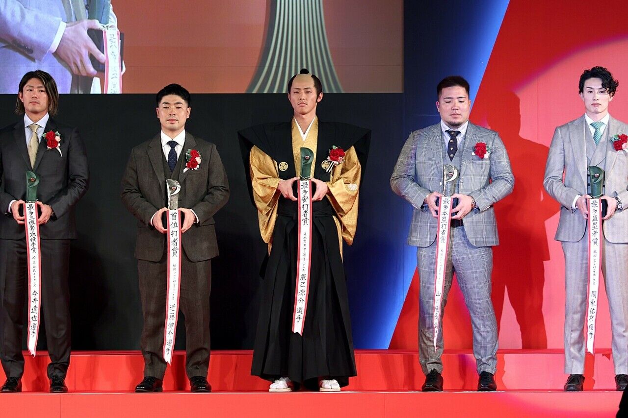 まずは最多安打の表彰。ちょんまげにはかま姿で登場し、「打者の賞なので『武者』とかけ、侍ジャパンもかかってます。今後もが『むしゃ』らに頑張っていきます」と話した。
