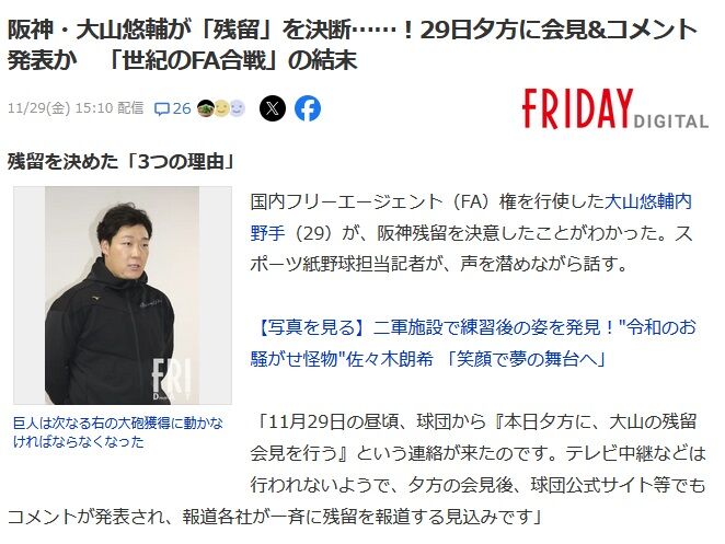 大山悠輔、阪神残留 本日夕方会見か