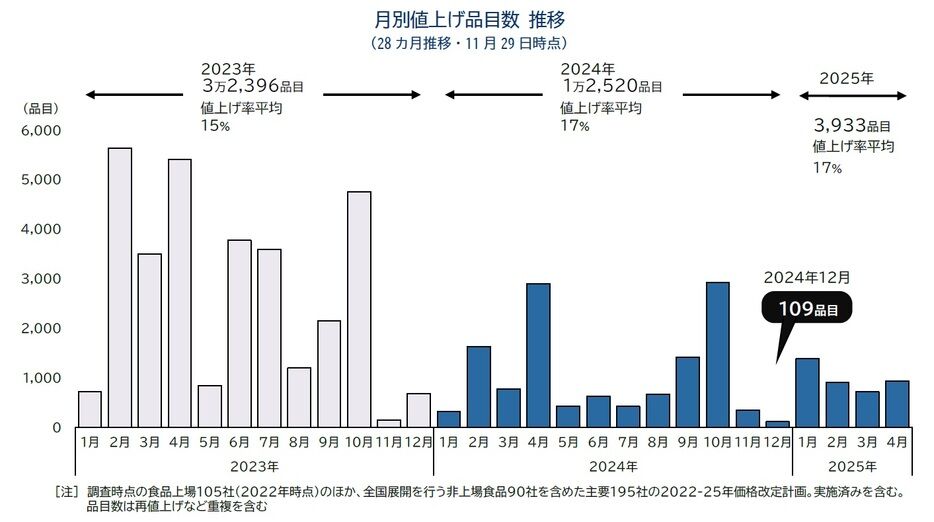 2025年は、1月以外にも2月・4月では今年11月末時点ですでに900品目超の値上げが予定されており、ともに単月で1千品目を超える可能性が高いとみられる。