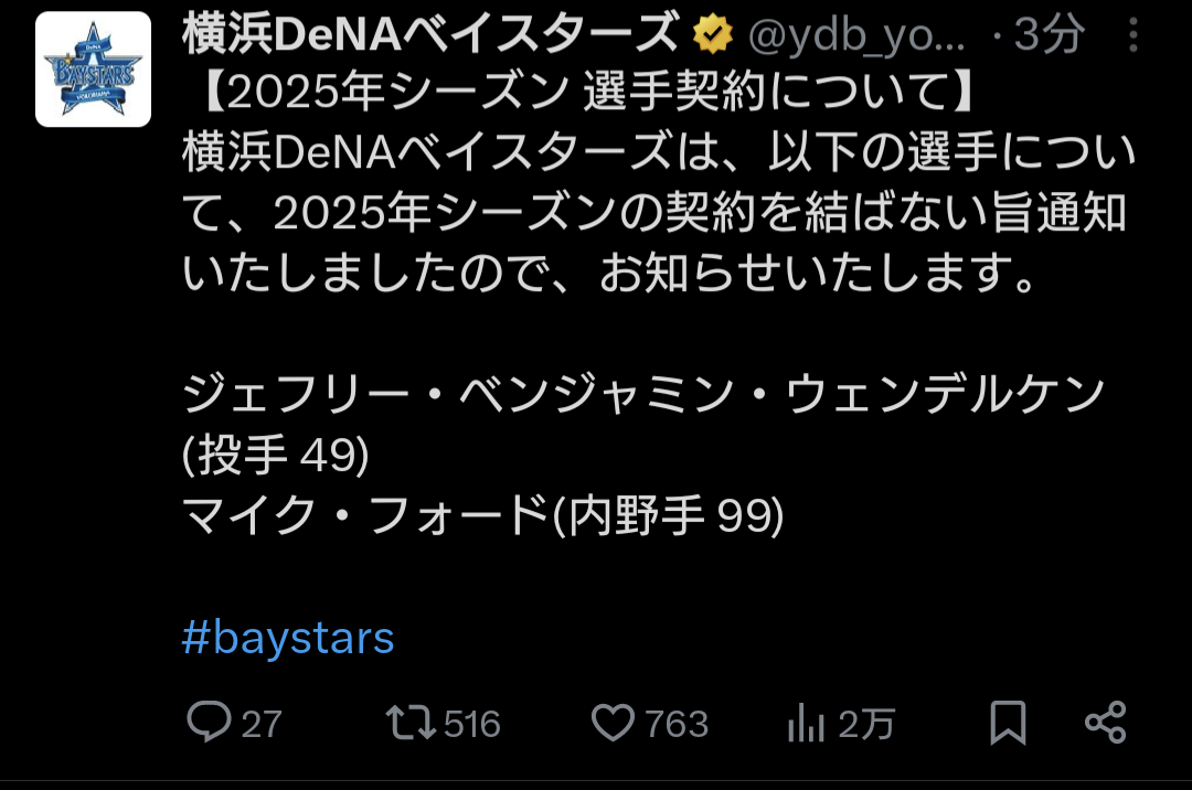 DeNA、ウェンデルケンとフォードの来季契約結ばず…