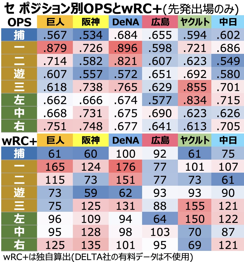 ポジション別OPSとwRC+ 二遊捕グロすぎるwwwwww