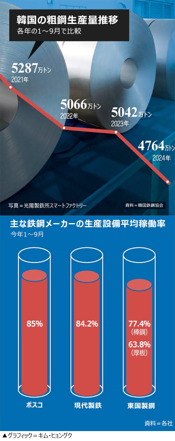 自動車、造船など韓国の中核産業をしっかりと支え、高品質の「メードインコリア」神話を作った鉄鋼業は低迷の泥沼に陥ったと指摘されている。専門家は「世界の鉄鋼需要が2023年にマイナス成長を記録したのに続き、24年と25年も1%台の成長にとどまる」と予想した。
