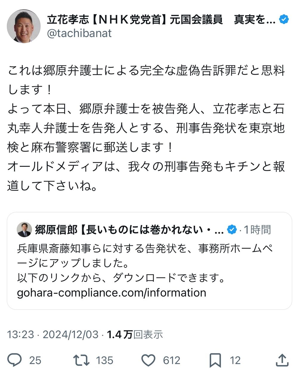 オールドメディアは、我々の刑事告発もキチンと報道して下さいね。 https://t.co/mQCA2MdJRv— 立花孝志【NHK党党首】 元国会議員 真実を発信する正義の人 (@tachibanat) December 3, 2024